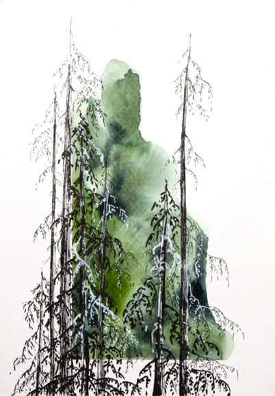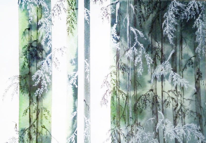 Le motif des méduses vient se déployer sur un fond aquarellé aux tonalités variées de bleus dans une dynamique ascensionnelle. S’échappant du cadre coloré, colonisant le papier resté en réserve. Comme pour les sapins j’essaie de créer une ambiance inquiétante liée à la prolifération à l’uniformisation et d’y introduire des échappées, de la désobéissance.